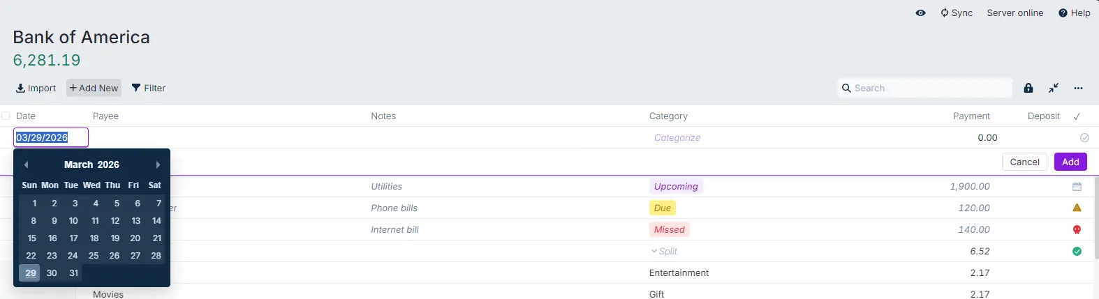 Manually adding transactions can be done by clicking on Add New. The Payee and the Category fields will provide a dropdown menu of available options. You can add new payees directly from this view, but if you need to add a new category, you can only do so from the Budget View.