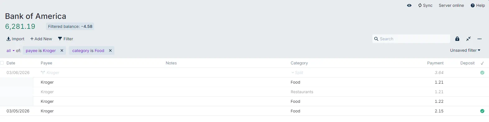 Clicking on the Filter lets you filter on all the fields. In the screenshot, we see that we filtered for where the Payee is Springfield Clothes and food and the Category equals just Clothing.