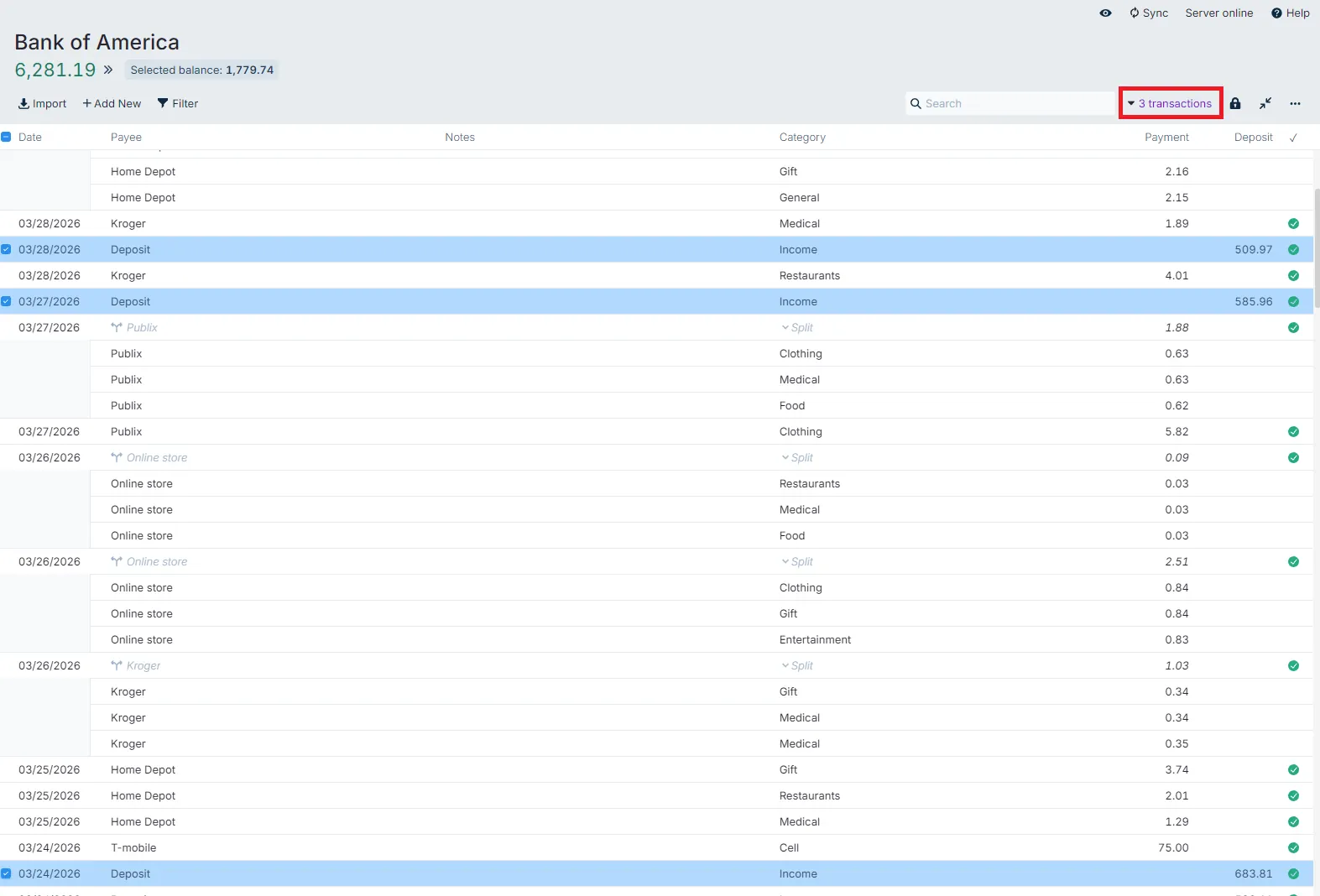 The top section also gives you access to several functions like importing transactions, manually adding new transactions, and filtering what transactions you see. On the right side you'll find the Search field which lets you quickly search all fields.